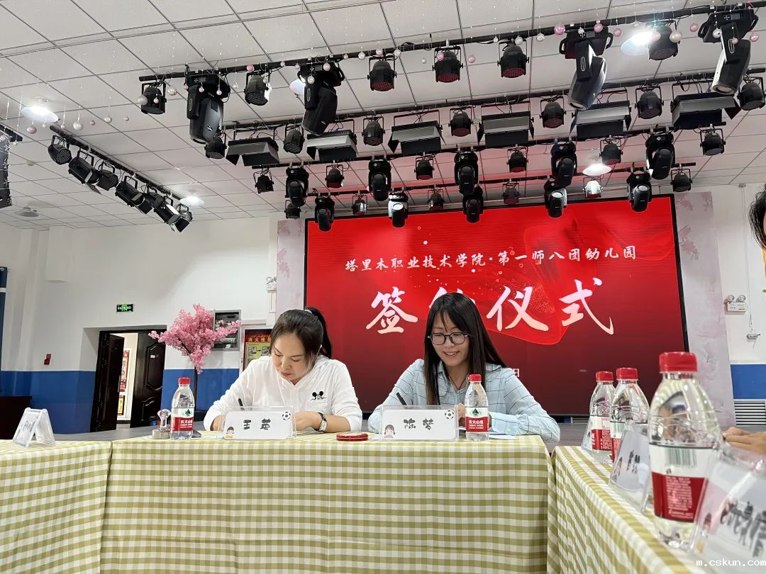 10月8日下午,教育健康学院学前教育专业与八团幼儿园签约挂牌仪式顺利举行。教育健康学院副院长陈梦参加签约挂牌仪式。她说:与八团幼儿园合作办学是专业与需求的“同频共振”,也是职业院校与企业发展的“携手并进”。在以后要充分发挥我院学前教育专业优势,进一步整合学前教育资源,与八团幼儿园实现资源共享、优势互补、合作双赢,促进学前教育专业发展,不断培养幼儿园所急需的专业人才。
