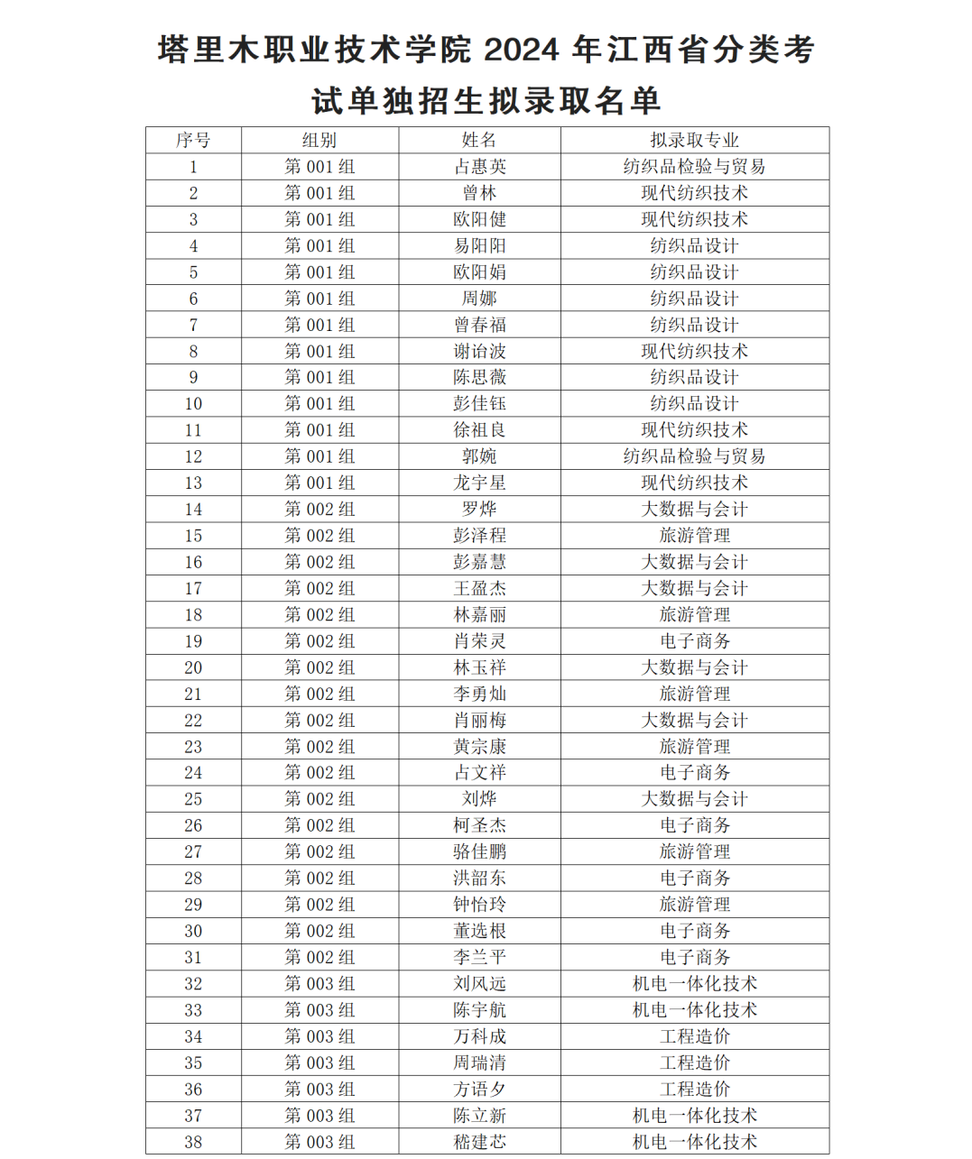 附件:伟德苹果客户端app下载官网2024年江西省分类考试单独招生拟录取名单
