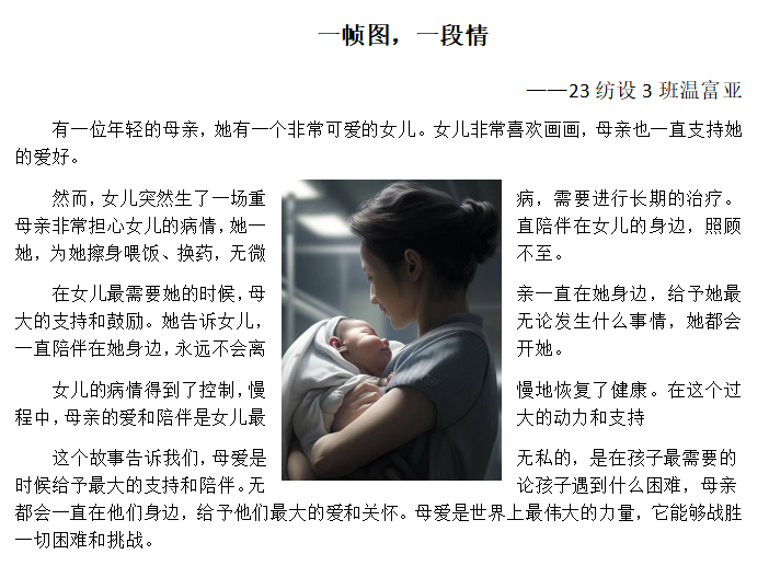 为了关注学生心理健康,促进学生全面发展,由纺织服装学院举办的“一帧图,一段情”说出爱的活动已然来到了尾声,在这次心理健康活动中,一位位同学们敞开了心扉,诉说着情感,向我们展示了自己生命中,被定格的那一瞬间。让我们一起来看看吧!