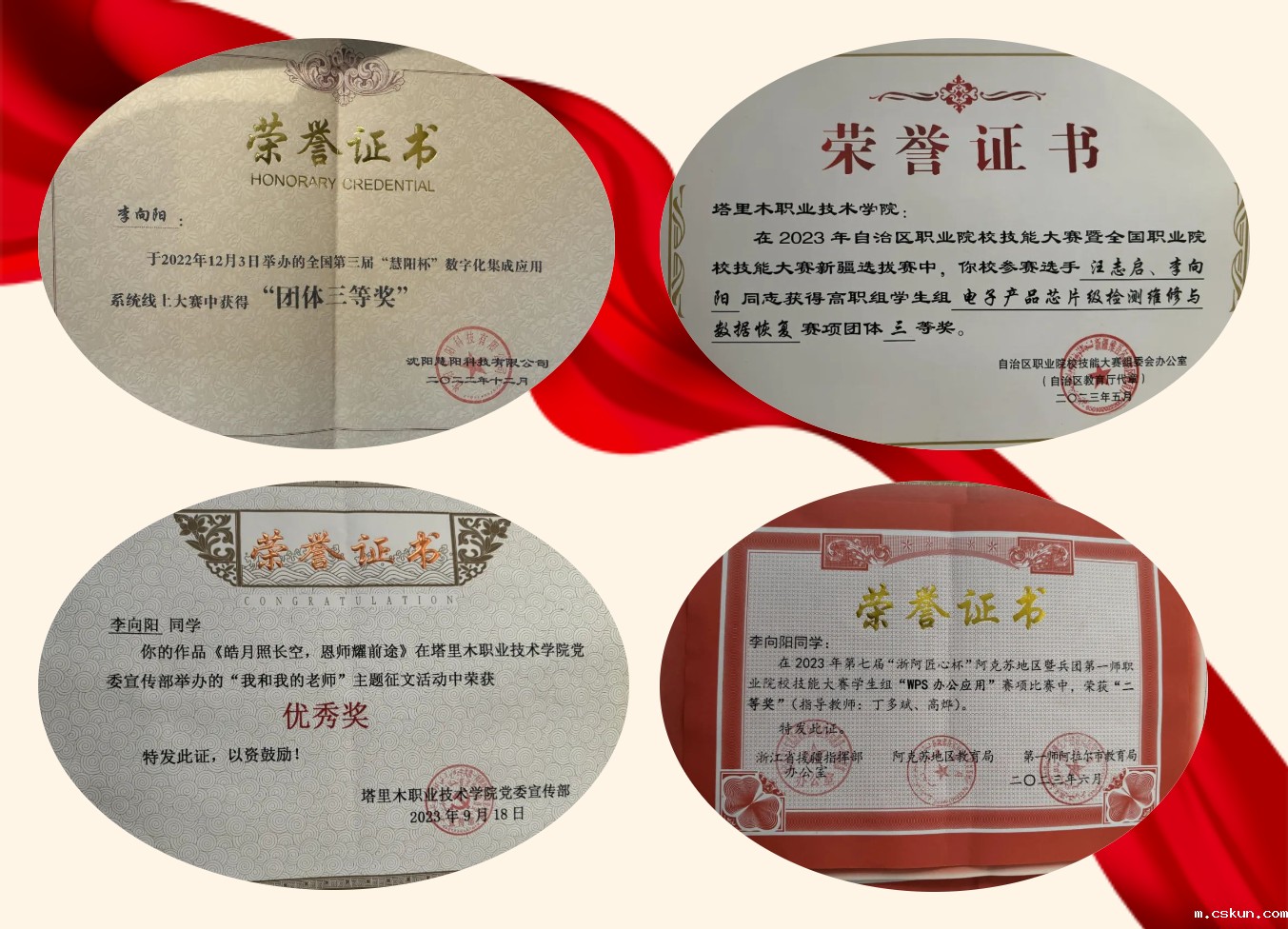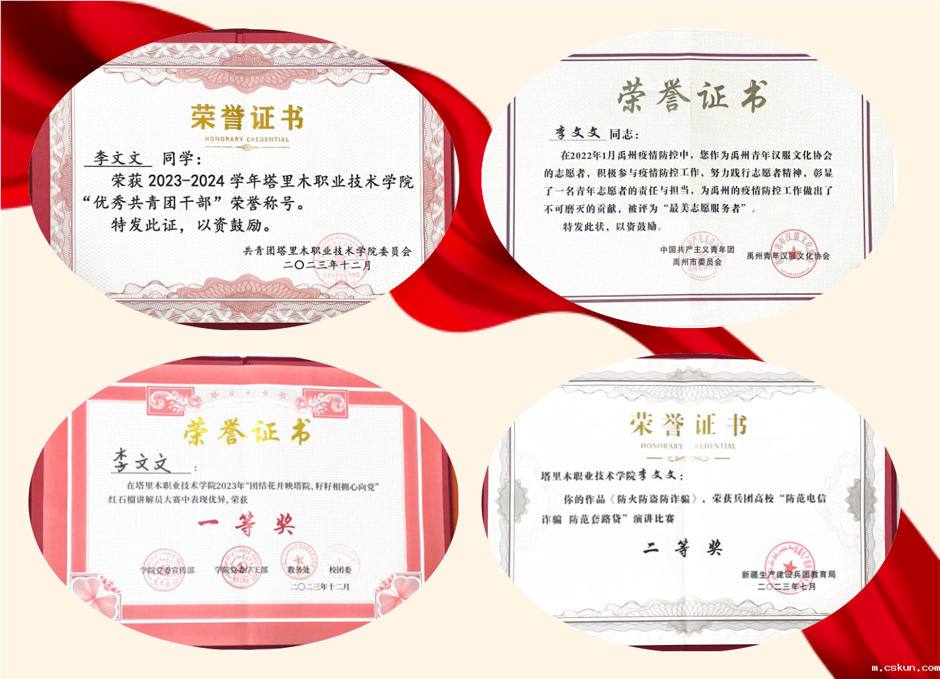 2022年,李文文以面试第一名成功考入伟德苹果客户端app下载官网。自入学以来,始终保持谦逊好学和不骄不躁的心态,几乎将自己每天都置身于学习的氛围中,在专业知识的学习上力求做到专精,在非专业方面上力求做到广博,积极参加学校及学院组织的各项活动,2023年5月代表伟德苹果客户端app下载官网参加兵团辩论赛。2023年6月代表伟德苹果客户端app下载官网去阿克苏职业技术学院参加浙阿杯比赛,多途径拓展知识面,培养跨学科思维,累计获得比赛类奖项21项。